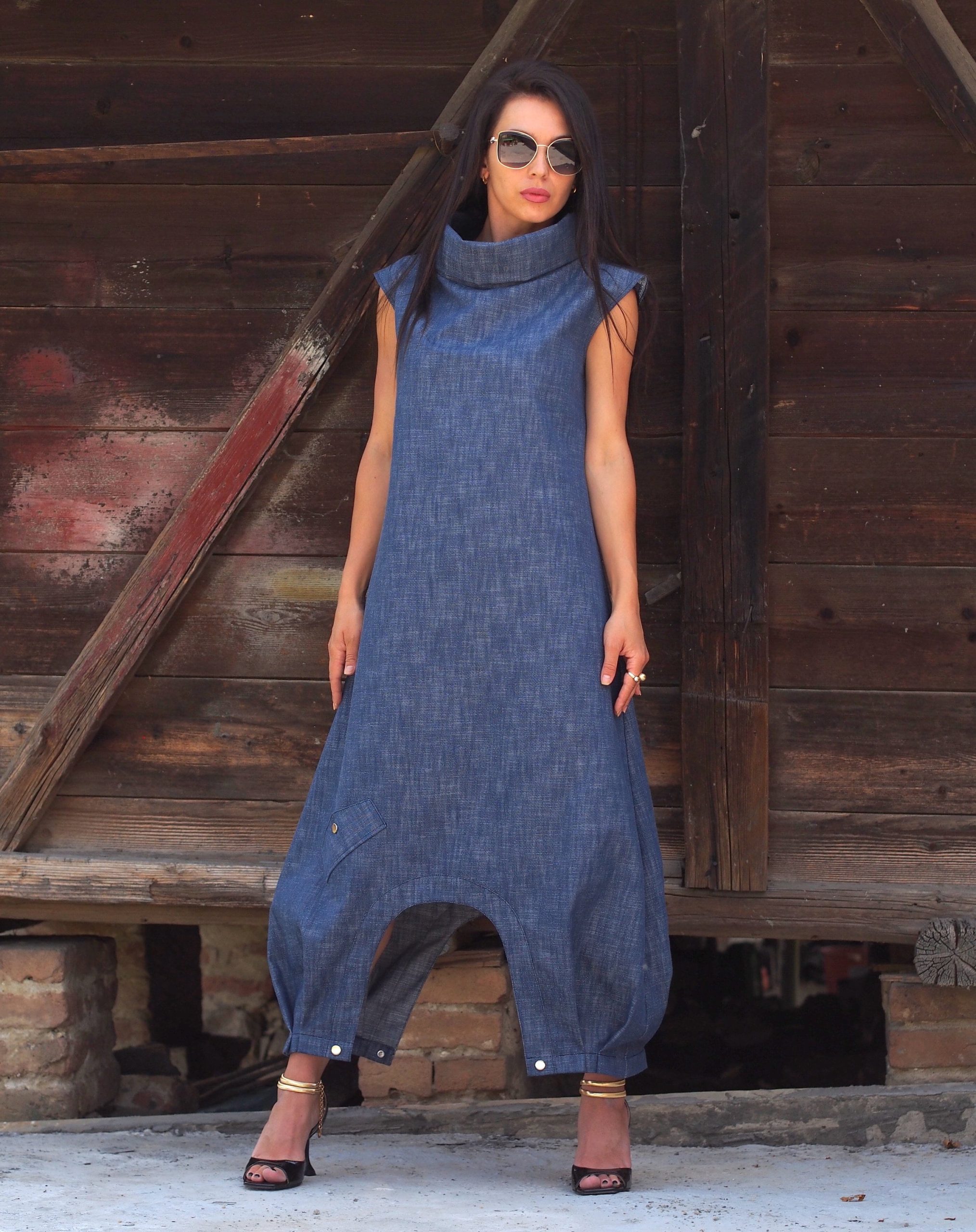 Sleeveless Long Denim Dress With Drop Crotch Cut